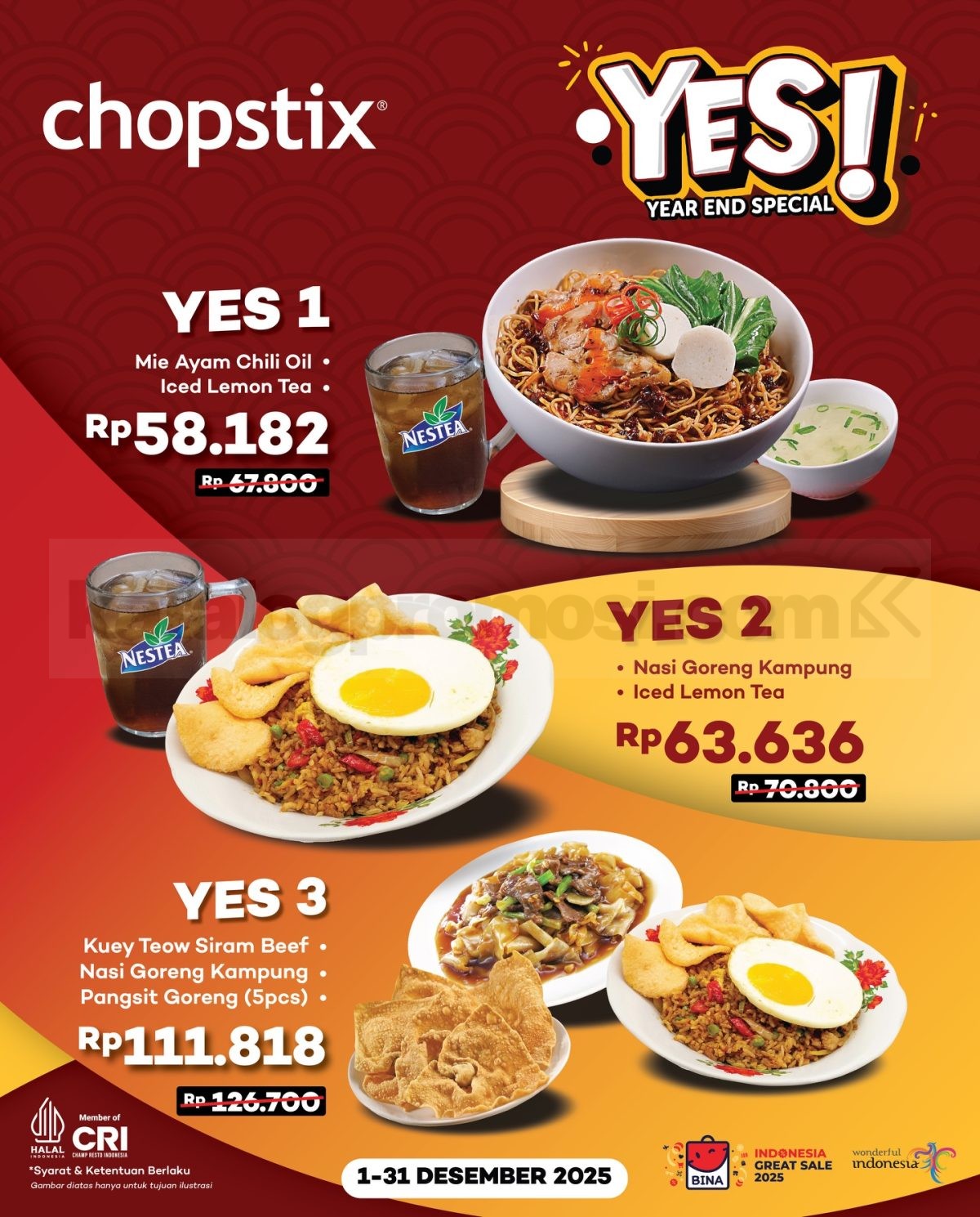 Promo Chopstix Year End Special mulai Rp. 58.182 dengan menu lengkap termasuk minum, berlaku 1โ31 Desember 2025 untuk dine in di seluruh outlet.