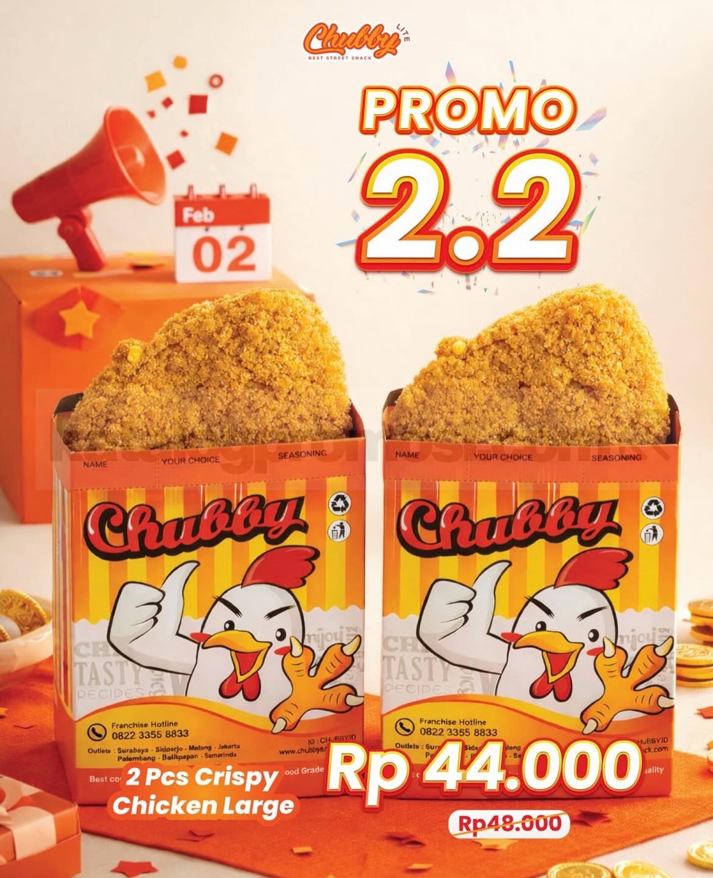 Promo Chubby 2.2 Deal 2 Large Crispy Chicken Rp. 44.000 berlaku hanya di tanggal 2 Februari 2026 untuk pembelian dine-in dan take away di outlet tertentu.