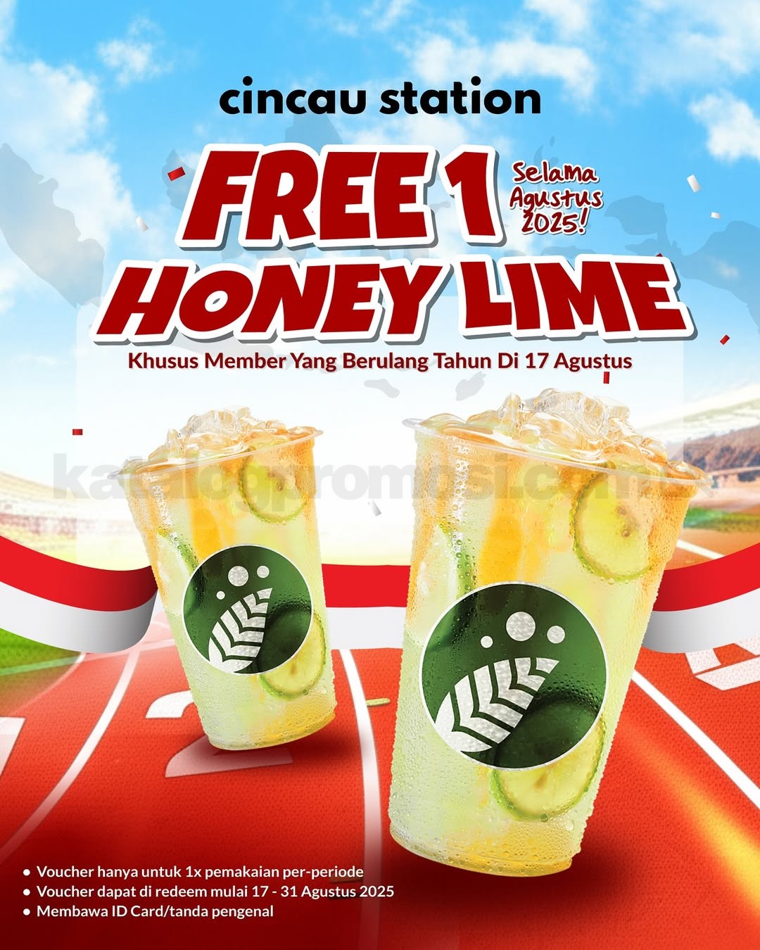 Promo Cincau Station Free Honey Lime buat member yang berulang ulang tahun di 17 Agustus! Periode reedem 17 – 31 Agustus 2025.