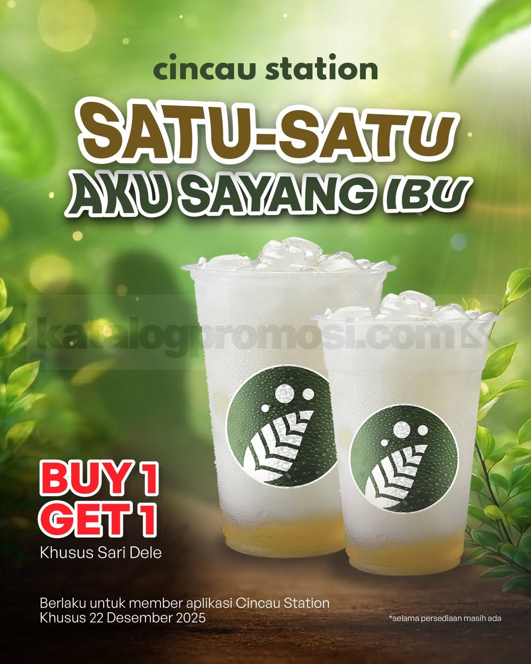 Promo Cincau Station Hari Ibu Buy 1 Get 1 Sari Dele minuman segar untuk dinikmati bersama, berlaku mulai tanggal 22 Desember 2025 di seluruh outlet.