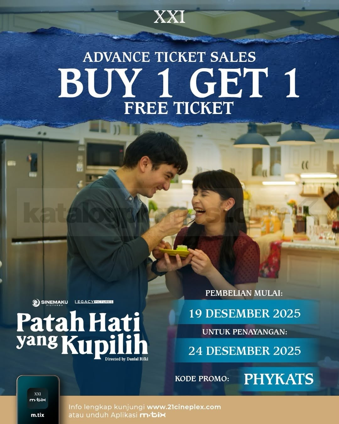 Promo Cinema XXI Advance Ticket Sales Beli 1 Gratis 1 Tiket Patah Hati yang Kupilih, beli dua tiket bayar satu via aplikasi m.tix, berlaku mulai tanggal 19 Desember 2025.