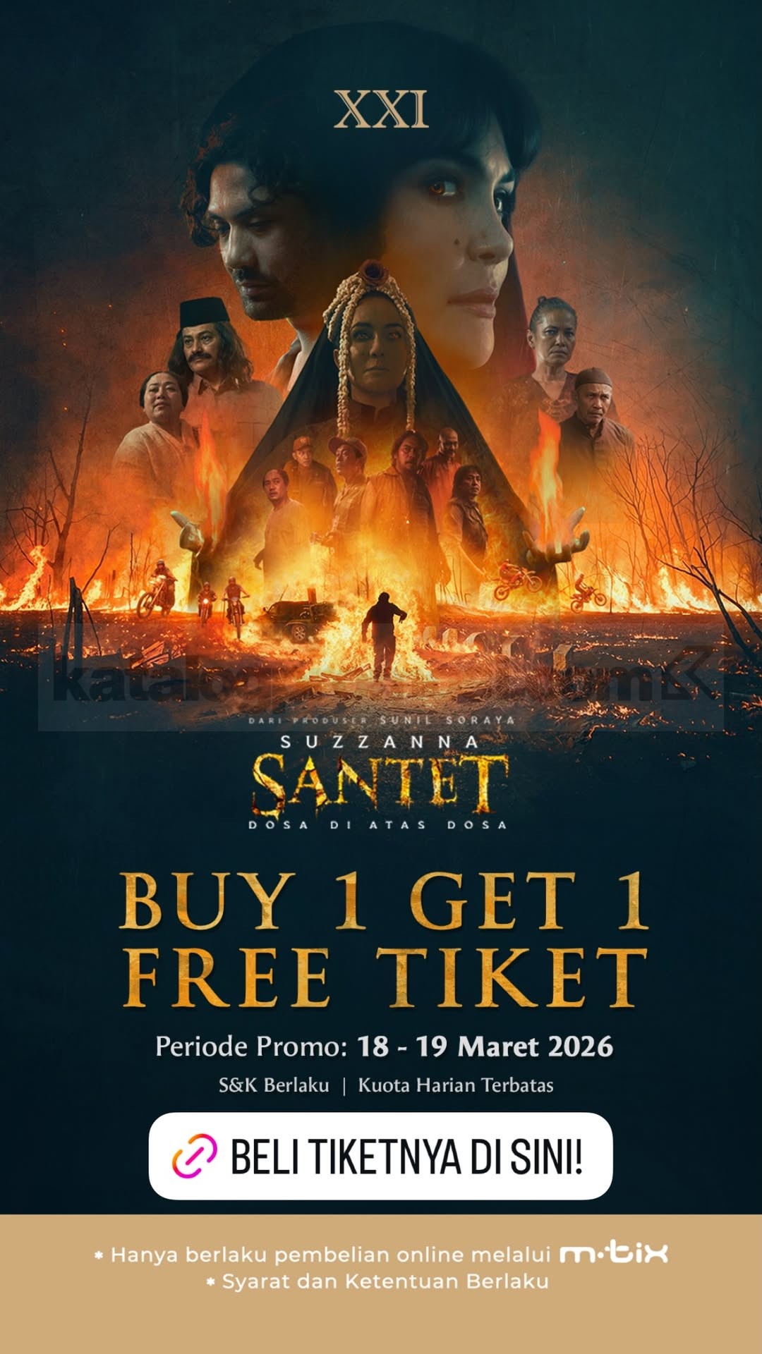 Promo Cinema XXI Beli 1 Gratis 1 Suzzanna Santet Dosa Di Atas Dosa via m.tix dengan e-voucher berlaku mulai tanggal 18 Maret 2026 – 19 Maret 2026
