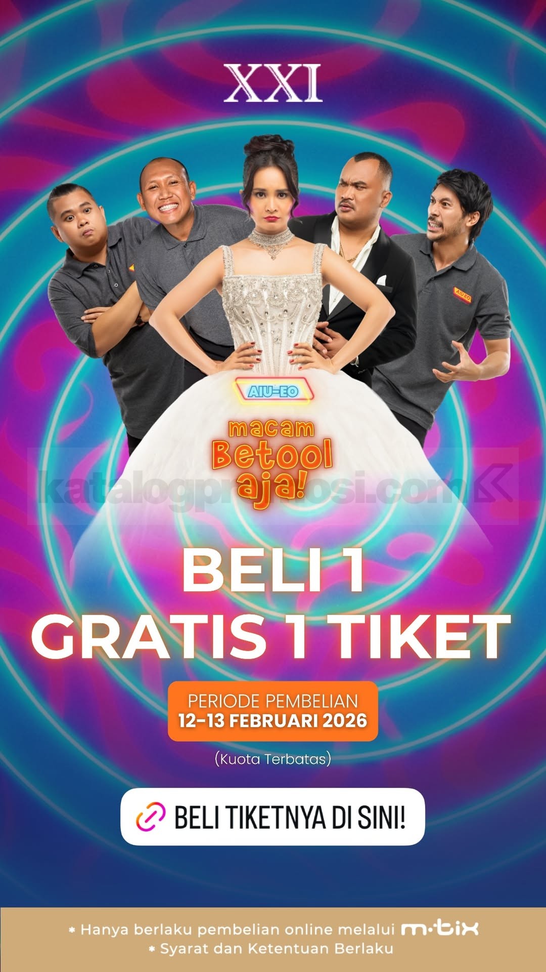 Promo Cinema XXI Beli 1 Gratis 1 Tiket AIUEO Macam Betool Aja beli 2 tiket via m.tix berlaku mulai tanggal 12 – 13 Februari 2026