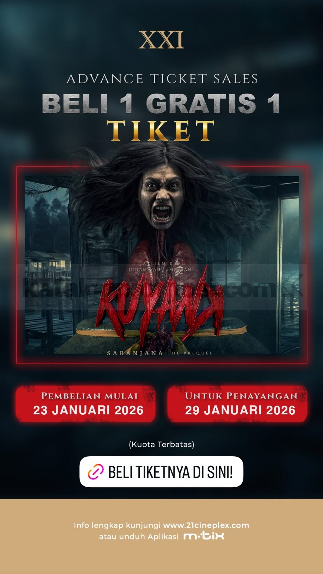 Promo Cinema XXI Beli 1 Gratis 1 Tiket Kuyank lewat aplikasi m.tix untuk advance ticket sales, berlaku mulai 23 Januari 2026–29 Januari 2026 di lokasi tertentu.