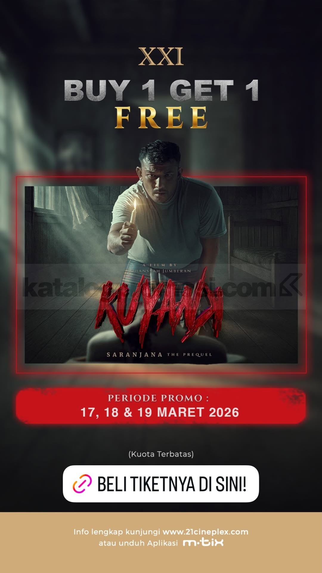 Promo Cinema XXI Beli 1 Gratis 1 Tiket Kuyank via m.tix dengan e-voucher berlaku mulai tanggal 17 Maret 2026 – 19 Maret 2026