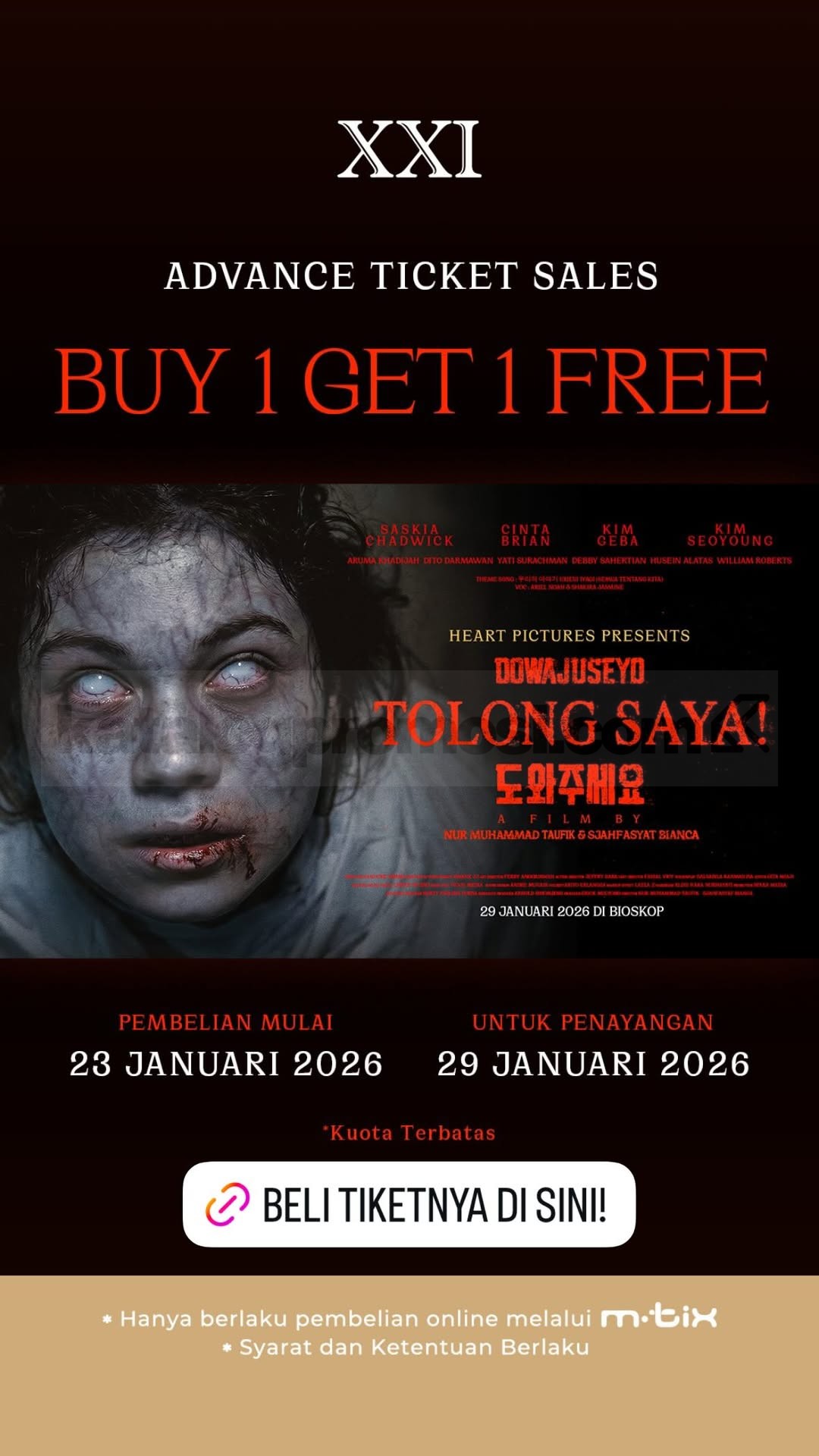 Promo Cinema XXI Beli 1 Gratis 1 Tiket Tolong Saya! (Dowa Juseyo) lewat aplikasi m.tix untuk advance ticket sales, berlaku mulai 23 Januari 2026–29 Januari 2026 di lokasi tertentu.