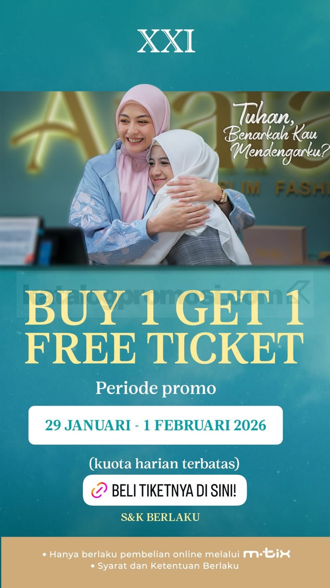 Promo Cinema XXI Beli 1 Gratis 1 tiket Tuhan Benarkah Kau Mendengarku, beli 2 tiket via aplikasi m.tix dengan e-voucher, berlaku mulai tanggal 29 Januari 2026 – 01 Februari 2026.