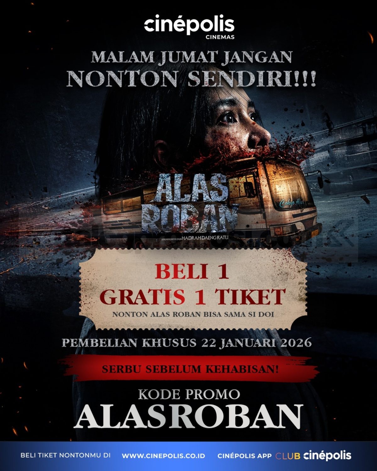Promo Cinépolis Beli 1 Gratis 1 Tiket Alas Roban, nonton horor berdua pakai kode ALASROBAN berlaku mulai tanggal 22 Januari 2026 di Cinépolis Indonesia.