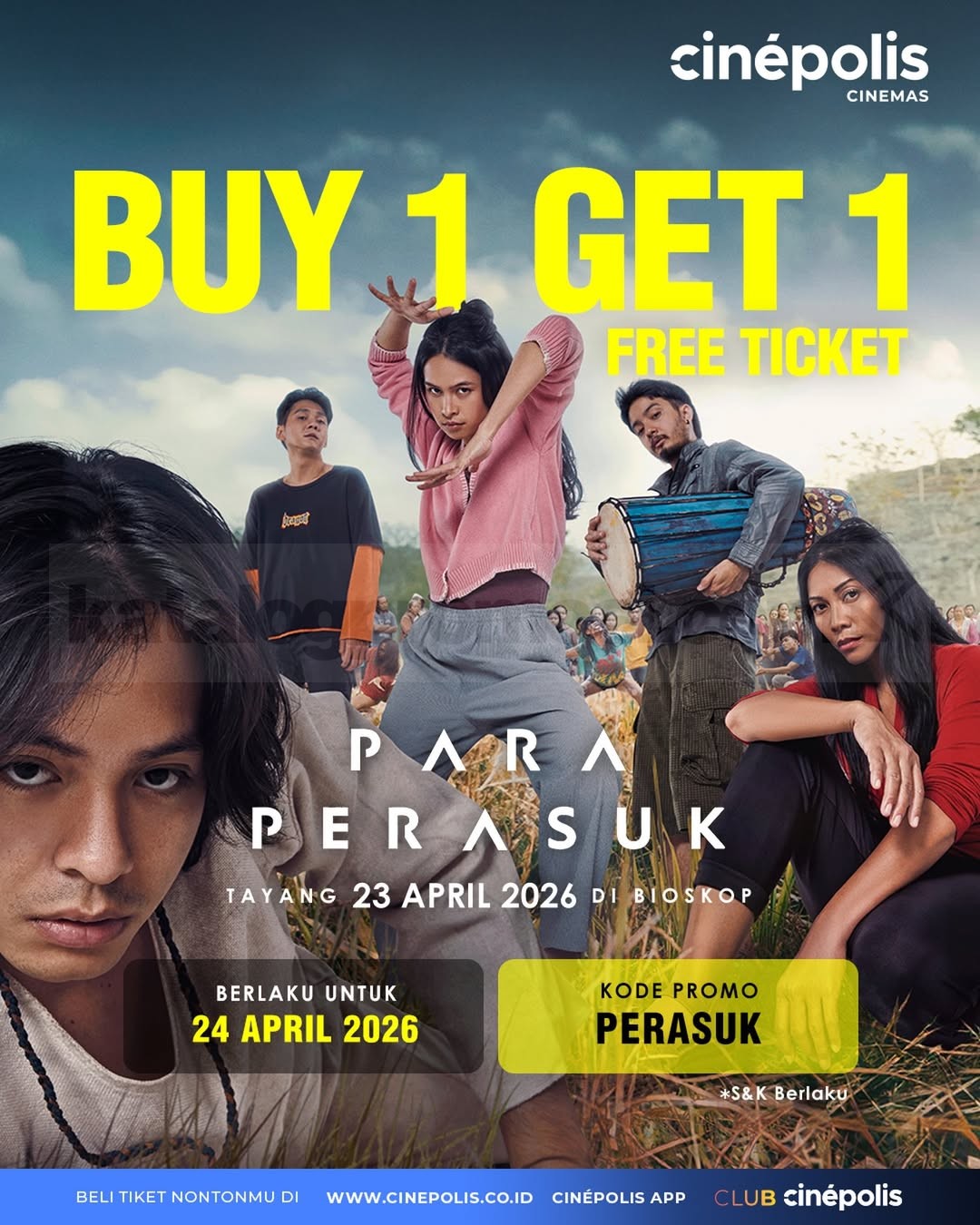 Promo Cinépolis Beli 1 Gratis 1 Tiket Para Perasuk jadi momen yang pas buat kamu yang ingin nonton film horor dengan sensasi berbeda tanpa keluar biaya lebih. Di tanggal 24 April 2026, kamu bisa menikmati promo BUY 1 GET 1 FREE TICKET untuk film Para Perasuk hanya dengan menggunakan kode promo PERASUK saat melakukan pemesanan tiket.