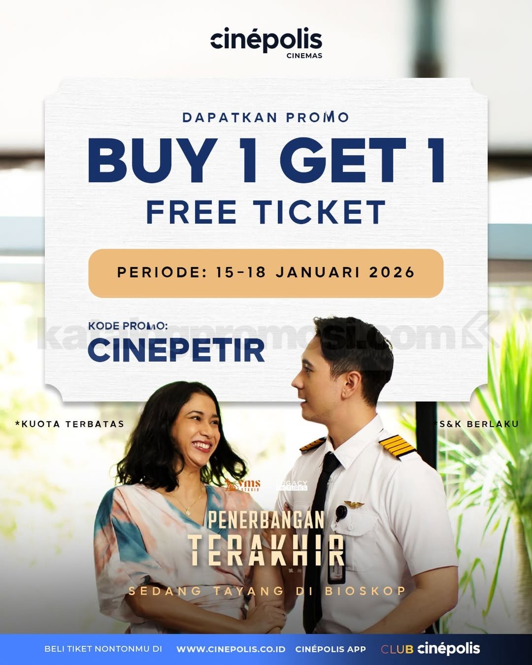 Promo Cinepolis Buy 1 Get 1 Free Tiket Penerbangan Terakhir, amankan kursi tambahan tanpa biaya + berlaku mulai 15-18 Januari 2026.