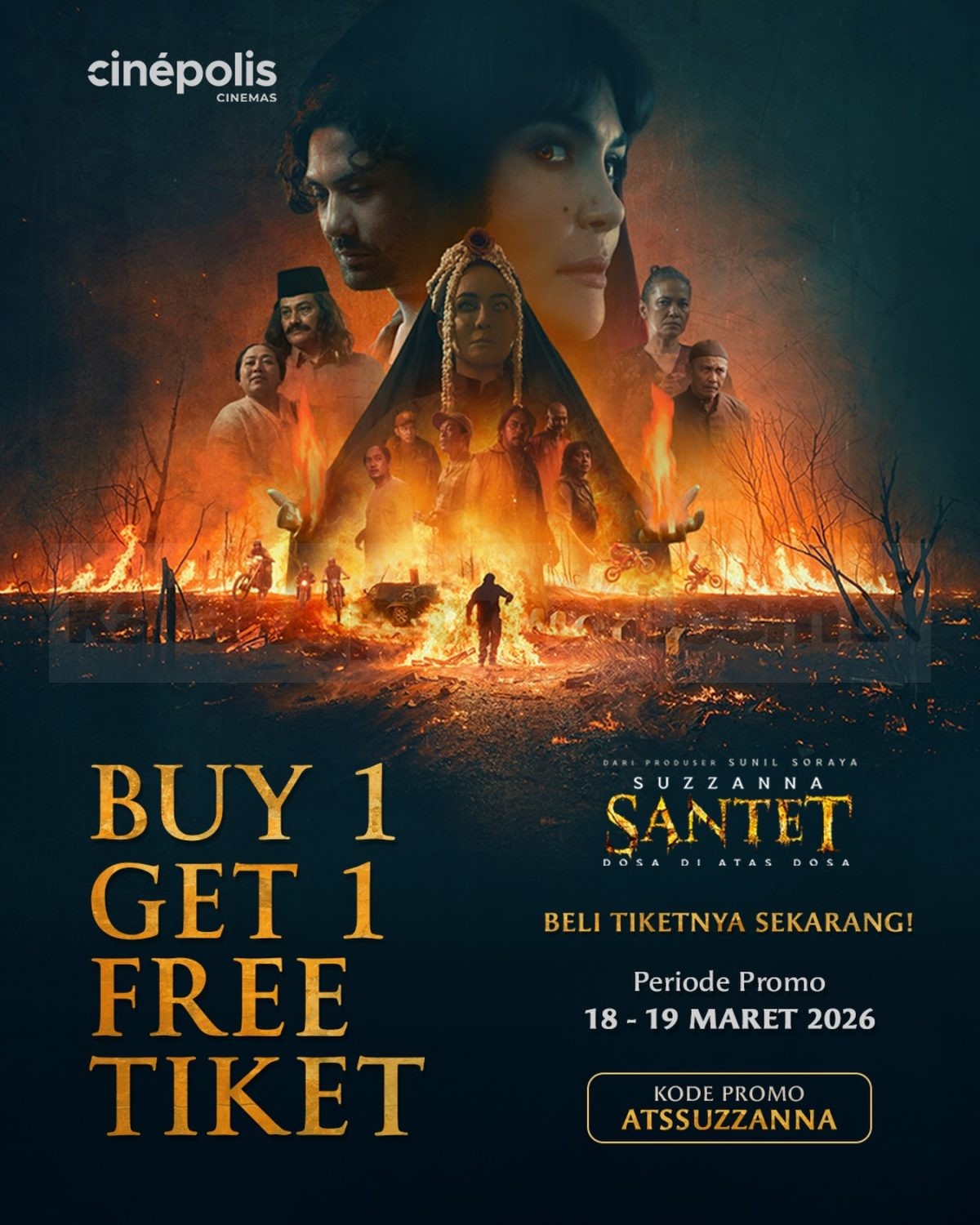 Promo Cinépolis Buy 1 Get 1 Ticket Suzzanna Santet Dosa Di Atas Dosa beli 1 tiket gratis 1 tiket dengan kode ATSSUZZANNA berlaku mulai tanggal 18 Maret 2026 – 19 Maret 2026 di Cinépolis Indonesia.
