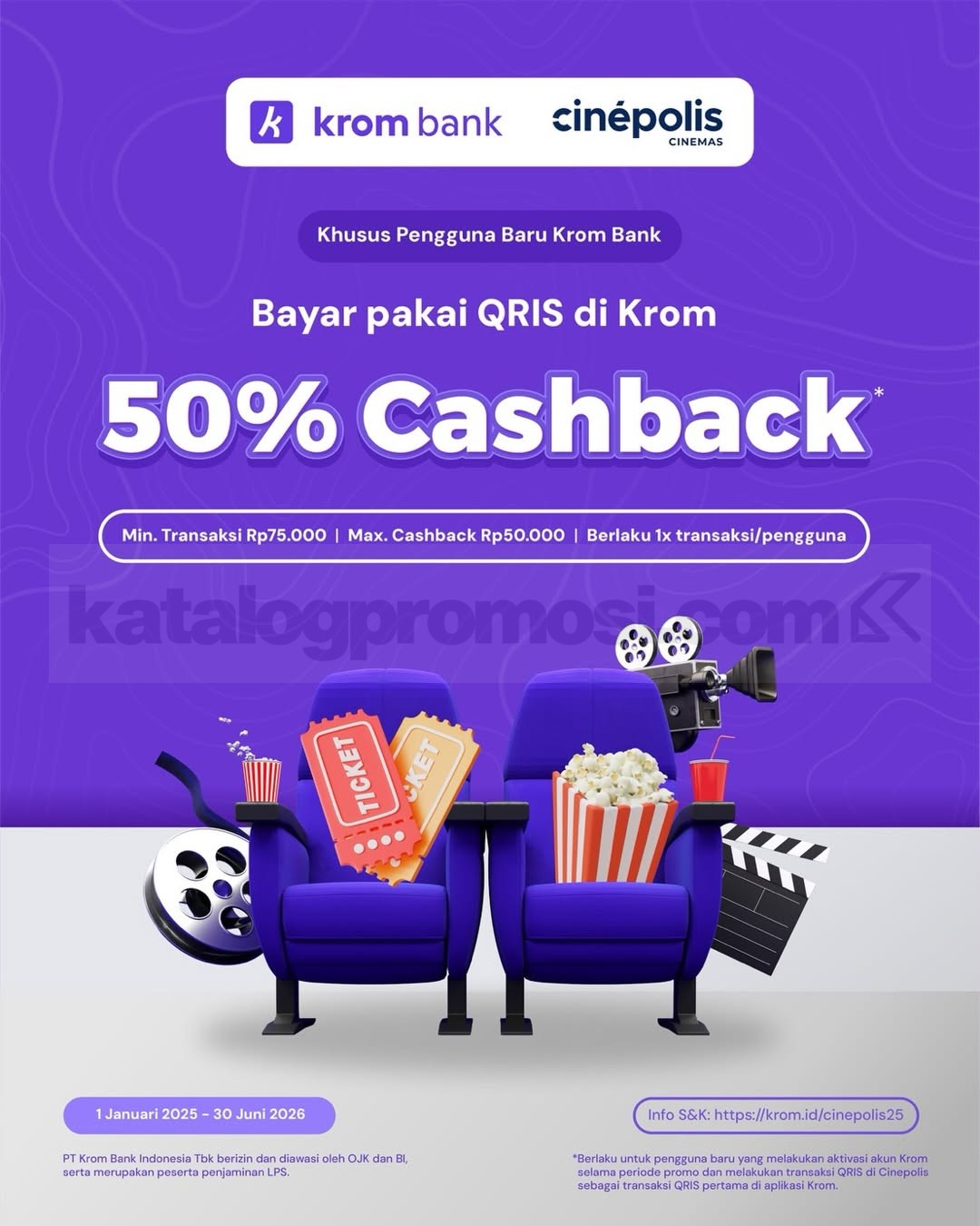 Promo Cinépolis Cinemas cashback 50% pakai QRIS Krom Bank, minimal transaksi Rp. 75.000, max cashback Rp. 50.000 berlaku 1 Januari – 30 Juni 2026.