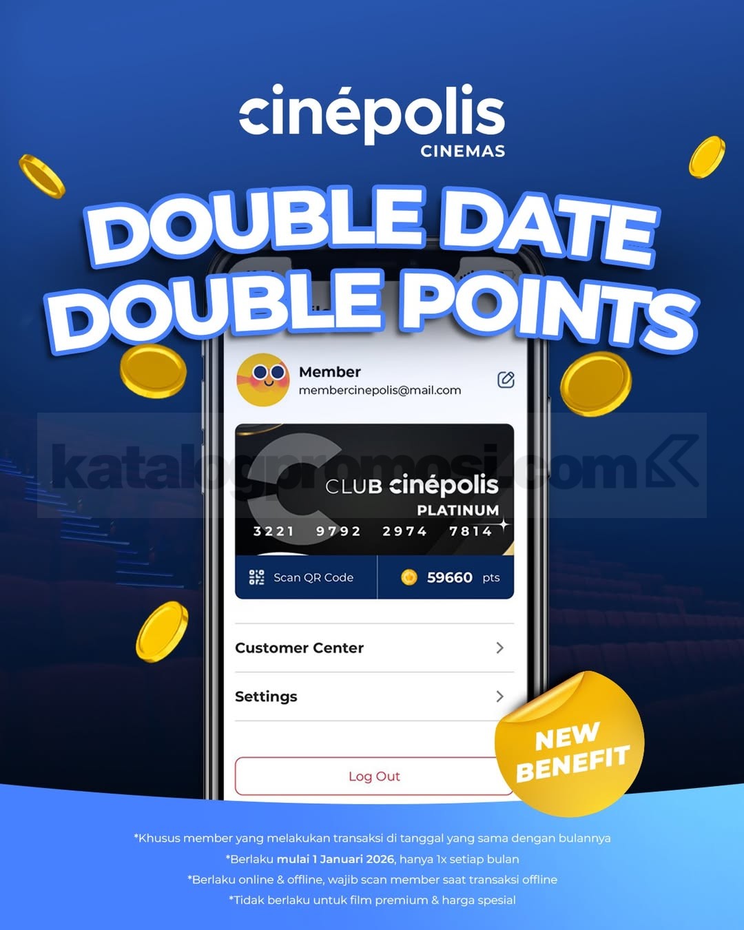 Promo Cinépolis Double Date Double Points Member poin 2x lipat transaksi online dan offline, scan member di tanggal kembar berlaku mulai 1 Januari 2026.