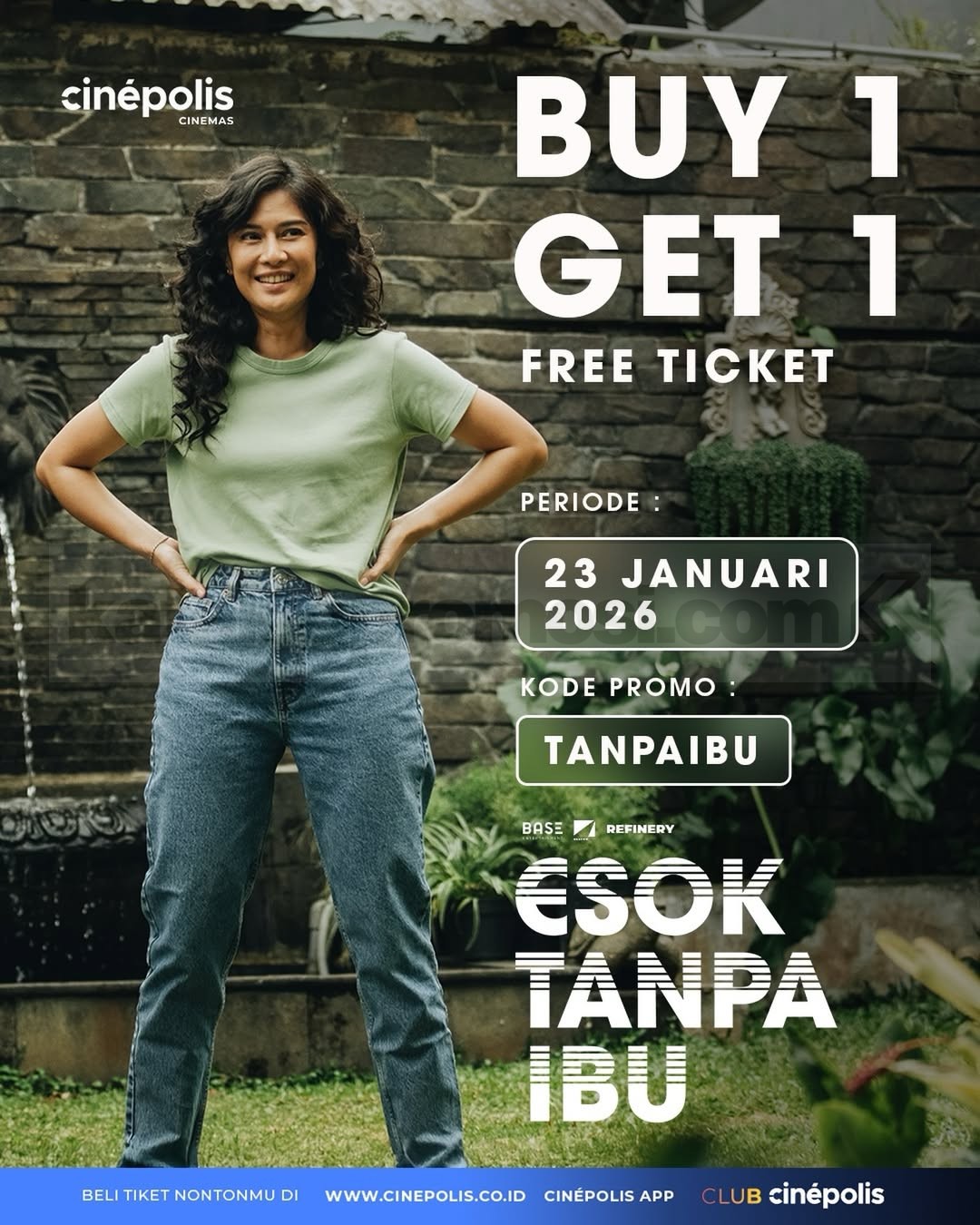 Promo Cinépolis Esok Tanpa Ibu beli 1 gratis 1 tiket, gunakan kode TANPAIBU via website dan aplikasi, berlaku 23 Januari 2026 di seluruh outlet.