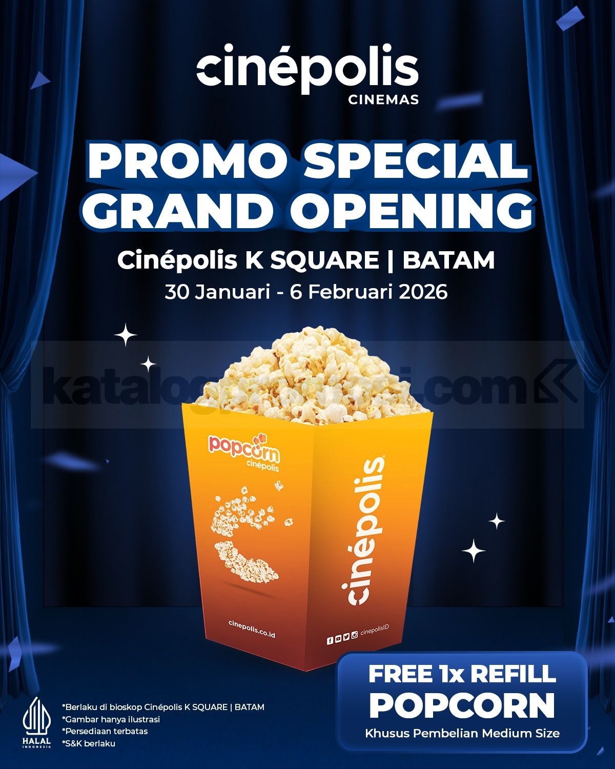 Promo Cinépolis Grand Opening K-Square beli 1 gratis 1 tiket nonton, refill popcorn dan minum gratis, berlaku mulai tanggal 30 Januari 2026 – 6 Februari 2026 di Batam.