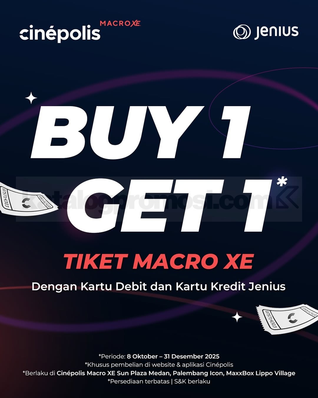 Promo Cinepolis Jenius Beli 1 Gratis 1 tiket Macro XE! Berlaku sampai tanggal 31 Desember 2025 di website & aplikasi Cinépolis.