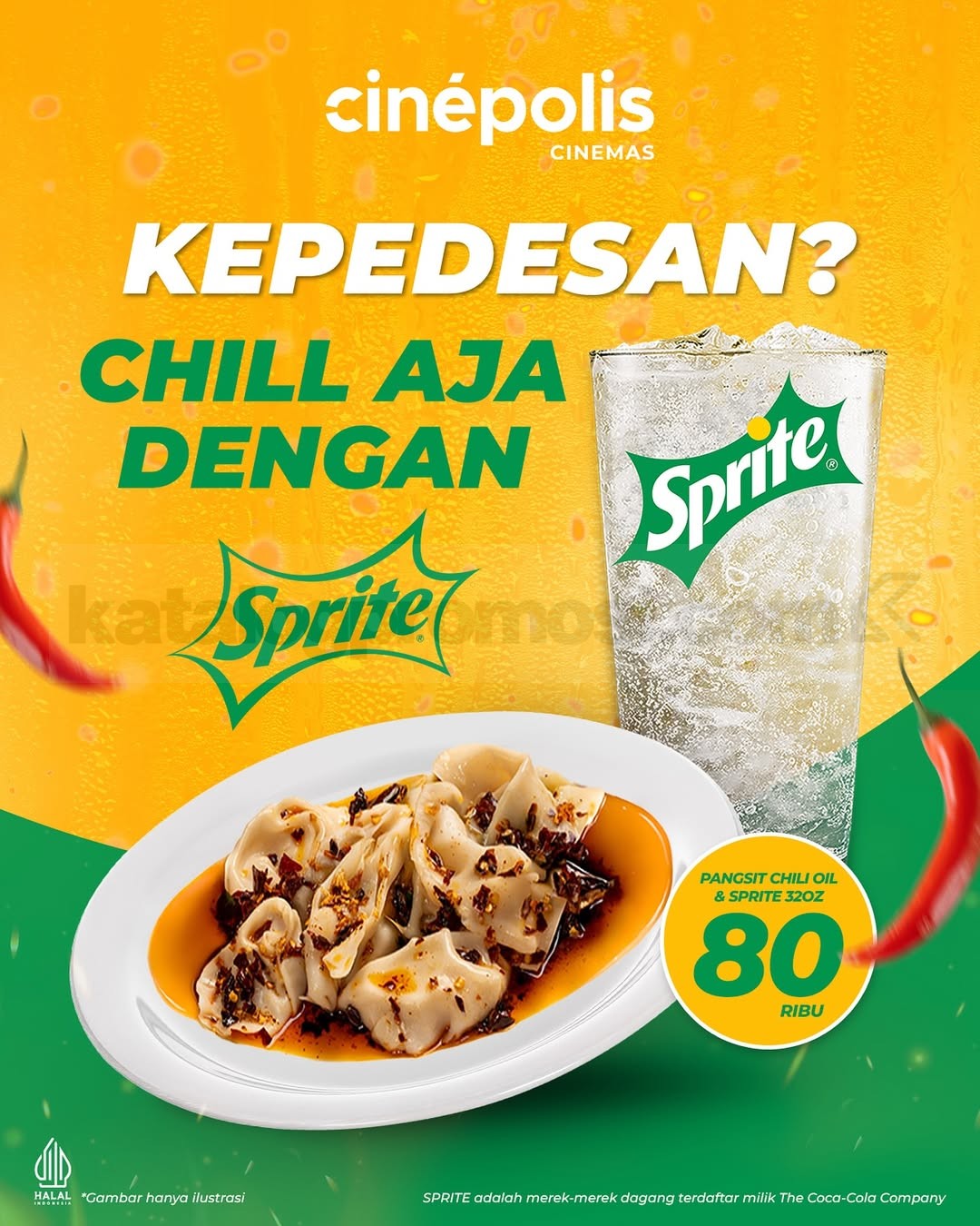 Promo Cinépolis Pangsit Chili Oil + Sprite Rp. 80.000, nikmati perpaduan pedas & segar saat nonton, berlaku selama persediaan masih ada