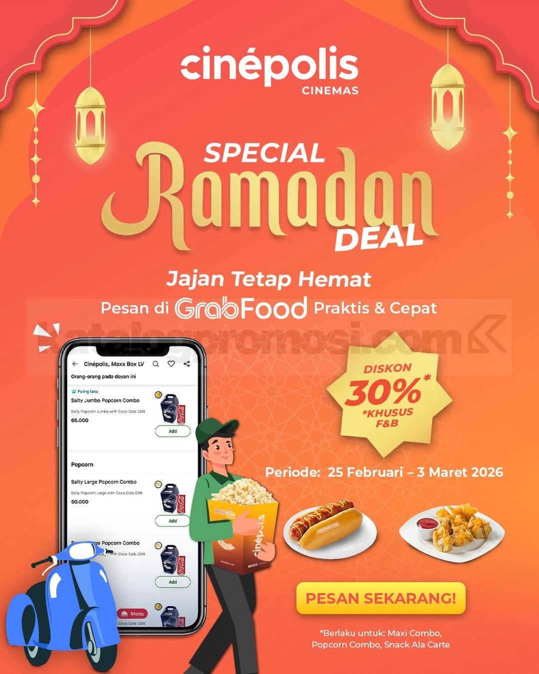 Promo CinĂ©polis Ramadan Deal Diskon 30% pesan F&B via GrabFood berlaku mulai tanggal 25 Februari 2026 – 3 Maret 2026 untuk menu combo dan snack pilihan