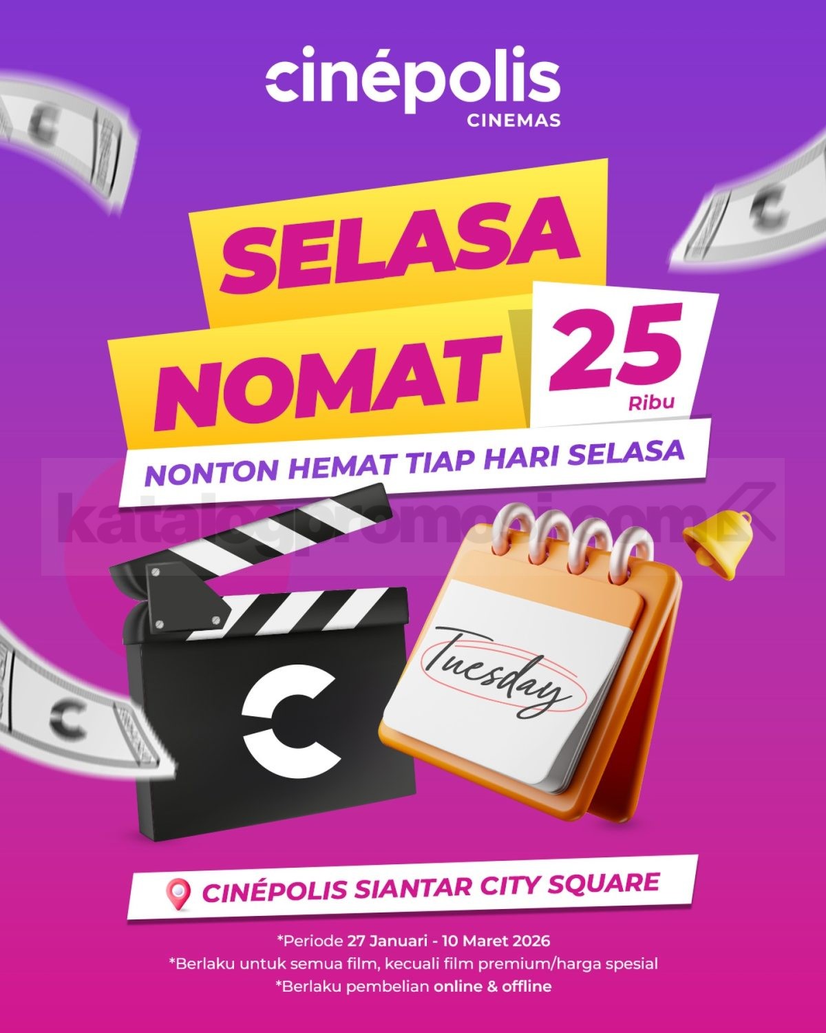 Promo Cinépolis Selasa Nonton Hemat Tiket Rp. 25 ribu nonton semua film reguler dengan harga lebih terjangkau, berlaku mulai tanggal 27 Januari 2026 – 10 Maret 2026 di Cinépolis Siantar City Square.
