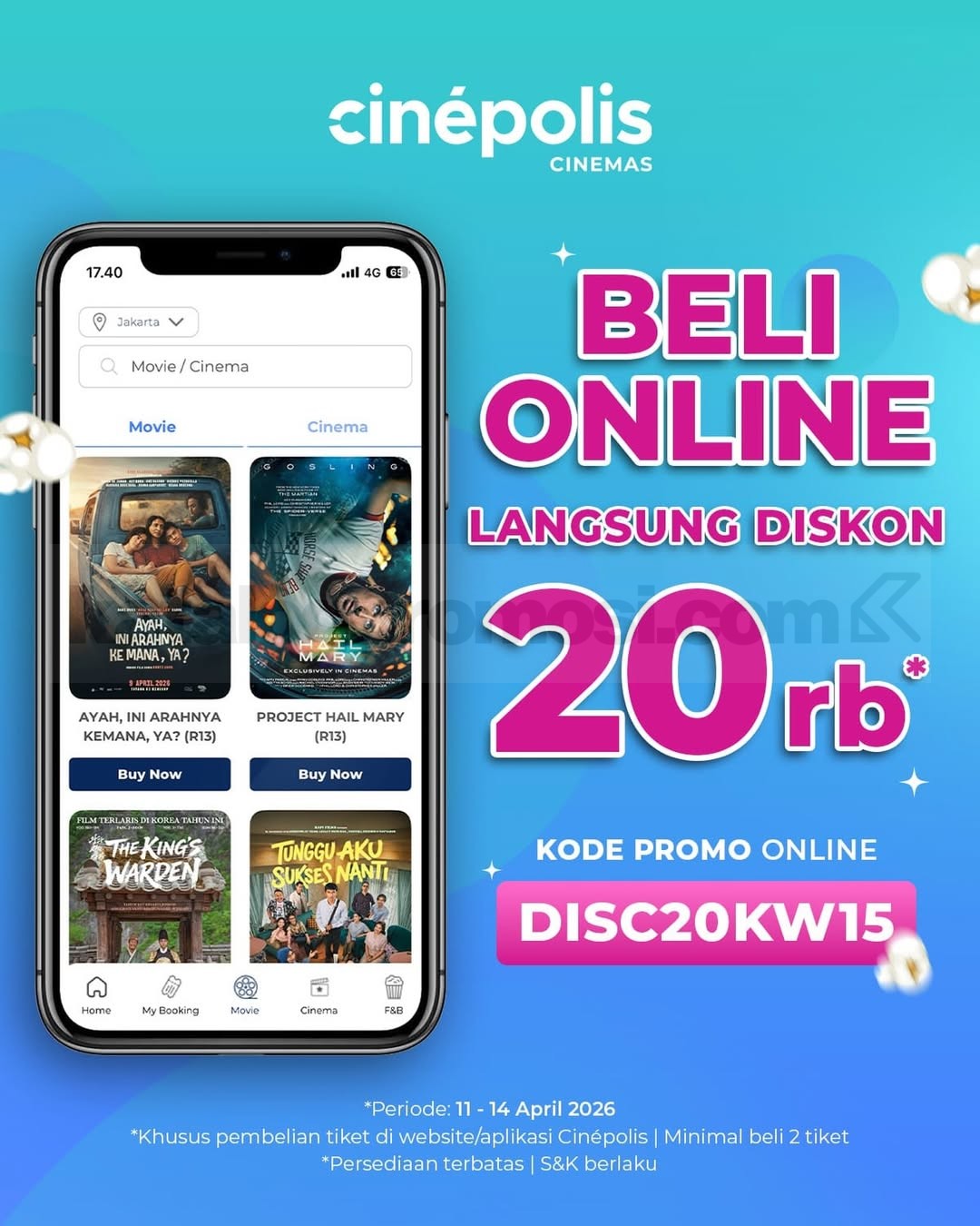 Promo Cinépolis Spesial Diskon Rp. 20.000 potongan tiket dengan kode DISC20KW15 minimal beli 2 tiket berlaku mulai tanggal 11 April 2026 – 14 April 2026