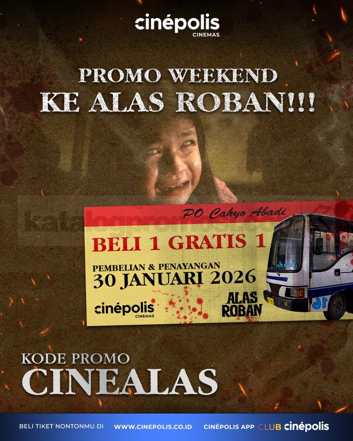 Promo Cinépolis Weekend Ke Alas Roban Beli 1 Gratis 1 Tiket nonton film Alas Roban dengan kode CINEALAS, berlaku mulai tanggal 30 Januari 2026 di Cinépolis Indonesia.