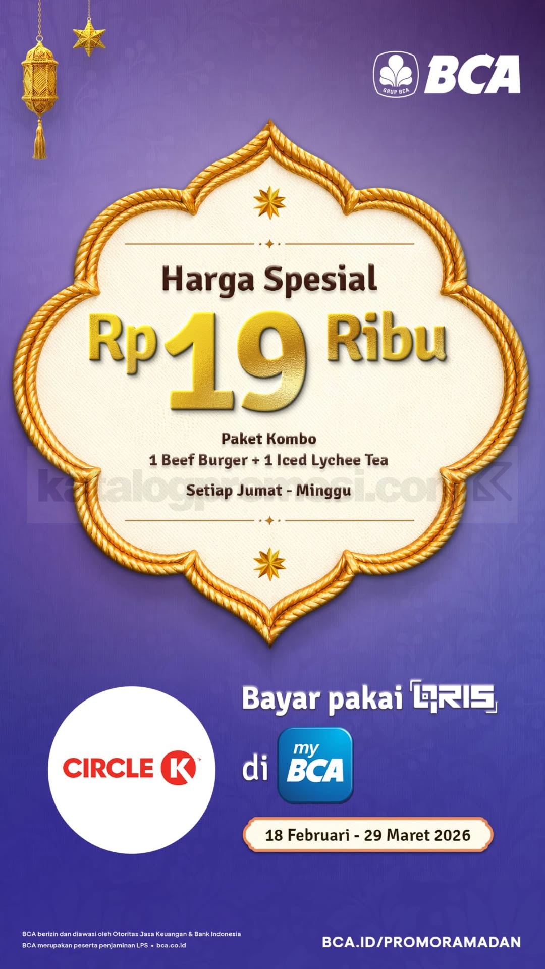 Promo Circle K BCA Paket Kombo Burger + Lychee Tea Rp. 19.000 bayar QRIS myBCA berlaku mulai tanggal 18 Februari 2026 – 29 Maret 2026 setiap Jumat – Minggu di Circle K.