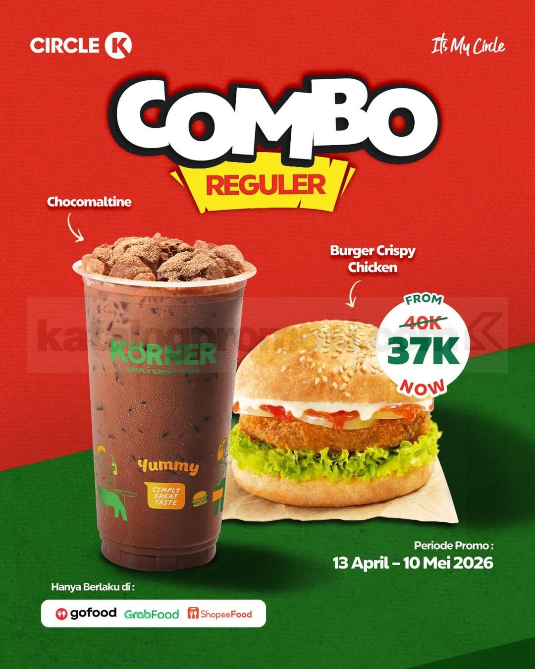 Promo Circle K Combo Reguler Rp. 37.000 paket burger dan minuman via GoFood, GrabFood, ShopeeFood berlaku mulai tanggal 13 April 2026 – 10 Mei 2026