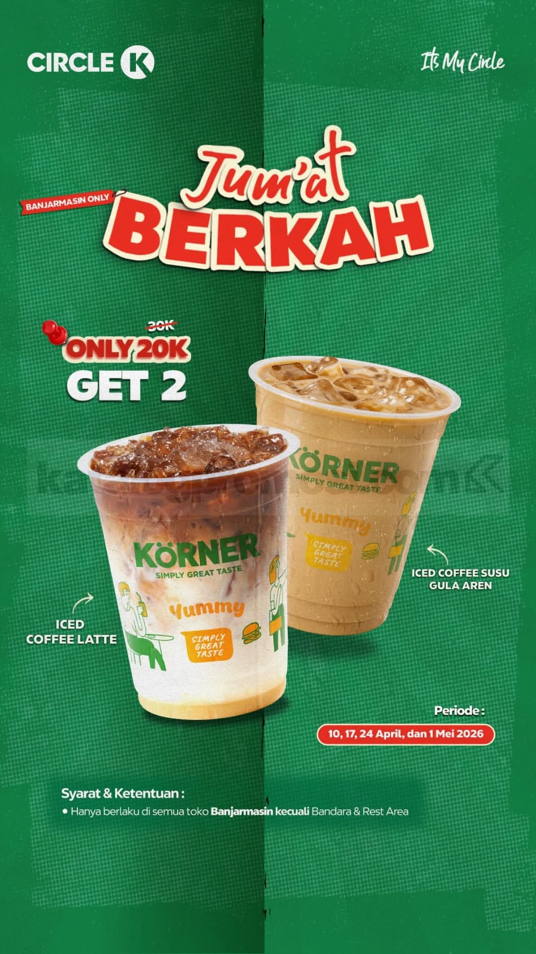 Promo Circle K Jumat Berkah 2 Minuman Rp. 20.000 pilihan iced coffee latte dan gula aren, berlaku mulai tanggal 10 April 2026 – 1 Mei 2026 di Circle K Banjarmasin
