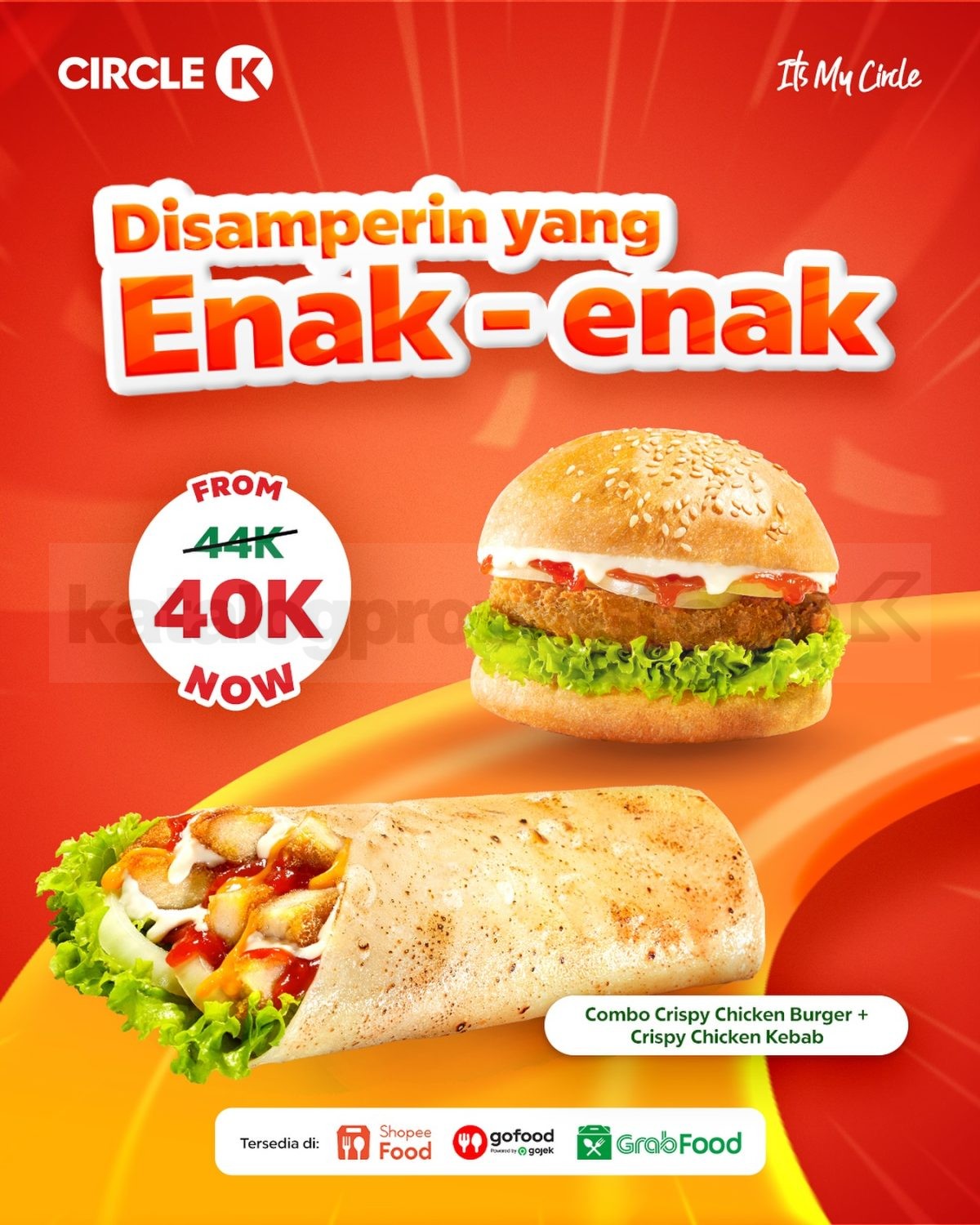 Makan siang gak perlu ribet ๐! Dengan Promo Circle K Online Delivery, kamu bisa langsung menikmati Chicken Kebab & Chicken Burger cuma Rp.40.000 lewat ShopeeFood, GoFood, atau GrabFood.
