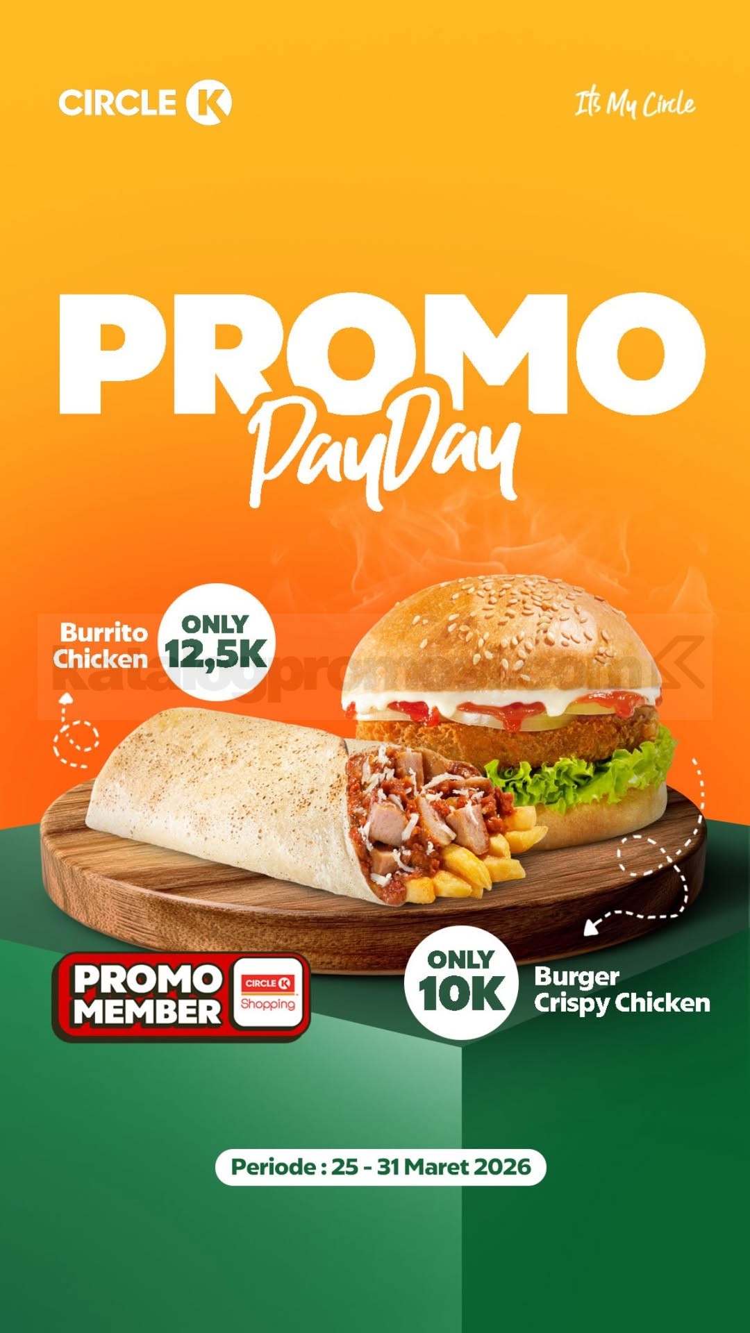 Manfaatkan kesempatan ini untuk mencicipi Burrito Chicken dan Burger Cripsy Chicken dengan harga super hemat. Promo Circle K Payday siap menemani hari-harimu, langsung cek aplikasinya dan nikmati sekarang! 🌟