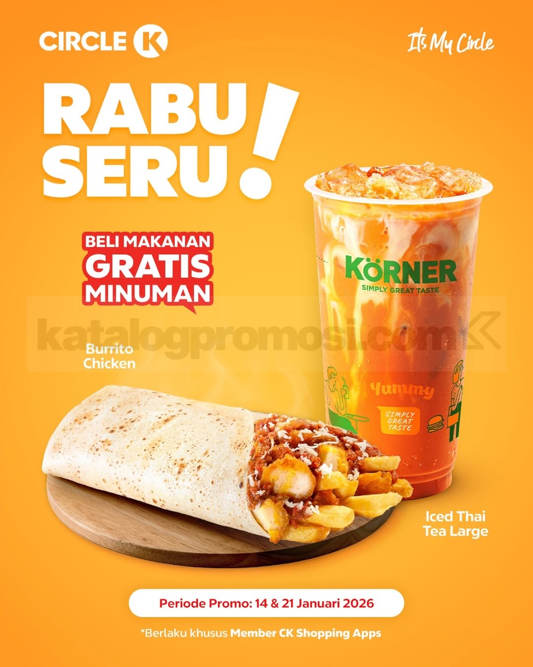 Promo Circle K Rabu Seru Beli 1 Gratis 1 beli Burrito Chicken gratis Iced Thai Tea Large berlaku mulai tanggal 14 Januari 2026 – 21 Januari 2026 untuk member CK Shopping Apps