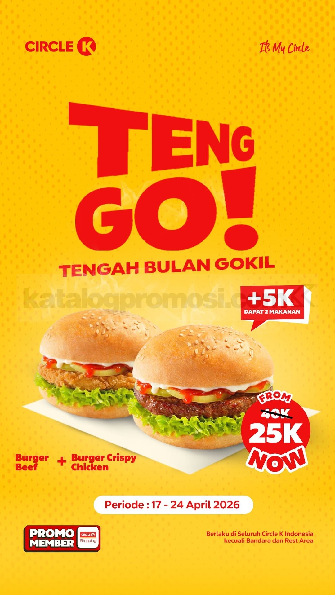 Promo Circle K TENG GO! Tambah Rp. 5.000 dapat 2 Burger, nikmati Burger Beef dan Crispy Chicken berlaku mulai tanggal 17 April 2026 – 24 April 2026 di seluruh outlet