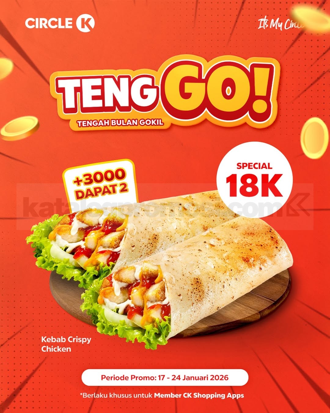 Promo Circle K Tengah Bulan Gokil Tambah Rp. 3.000 Dapat 2 Kebab untuk camilan hemat member CK Shopping Apps, berlaku mulai tanggal 17 Januari 2026 – 24 Januari 2026