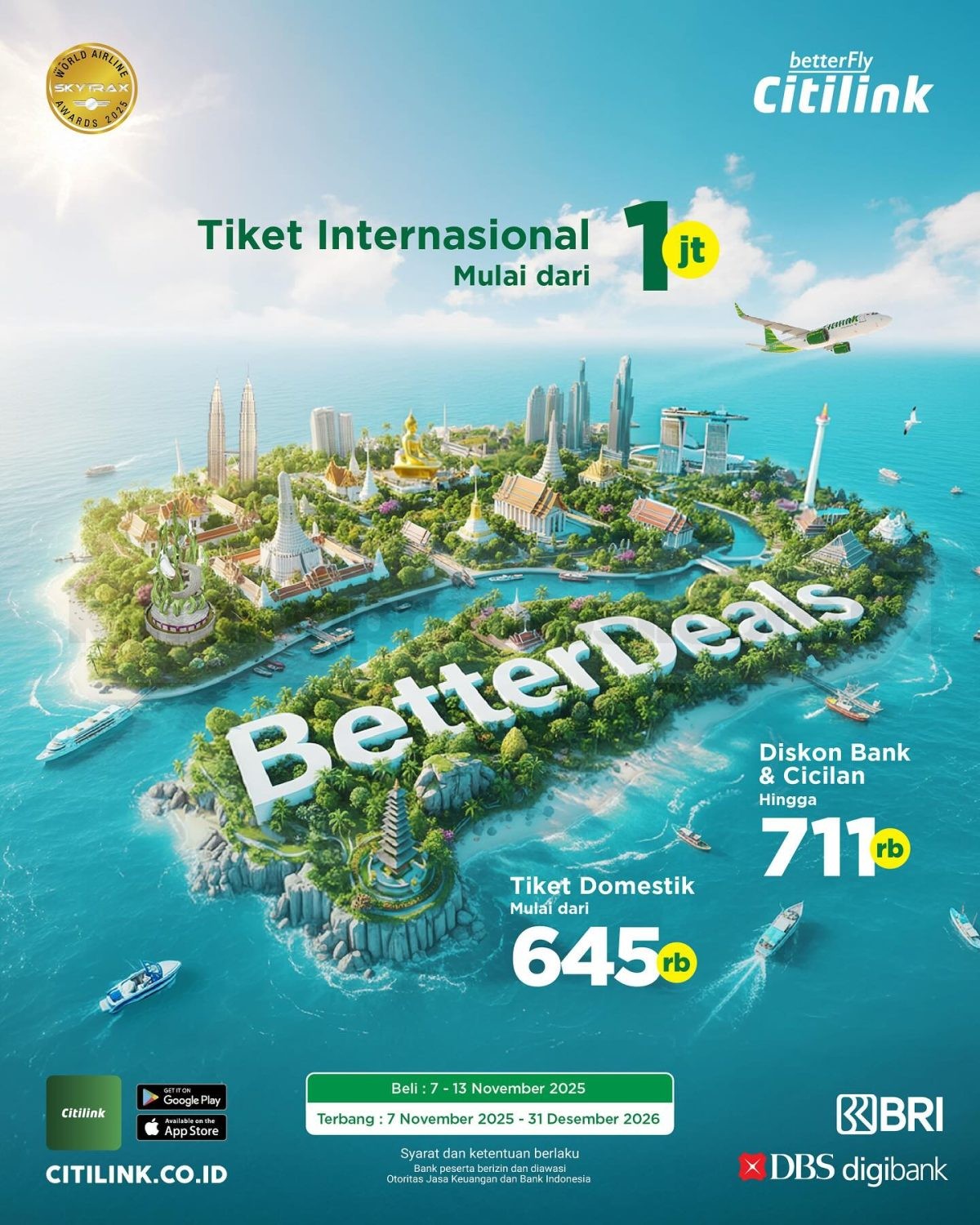 Jangan tunggu akhir tahun tanpa rencana liburan! โ๏ธ Dengan promo Citilink BetterDeals 11.11, kamu bisa terbang lebih hemat, dapat diskon besar, dan menikmati keuntungan eksklusif untuk member LinkMiles. Buruan pesan tiketmu sebelum kuotanya habis di citilink.co.id atau aplikasi Citilink! ๐ฟโจ
