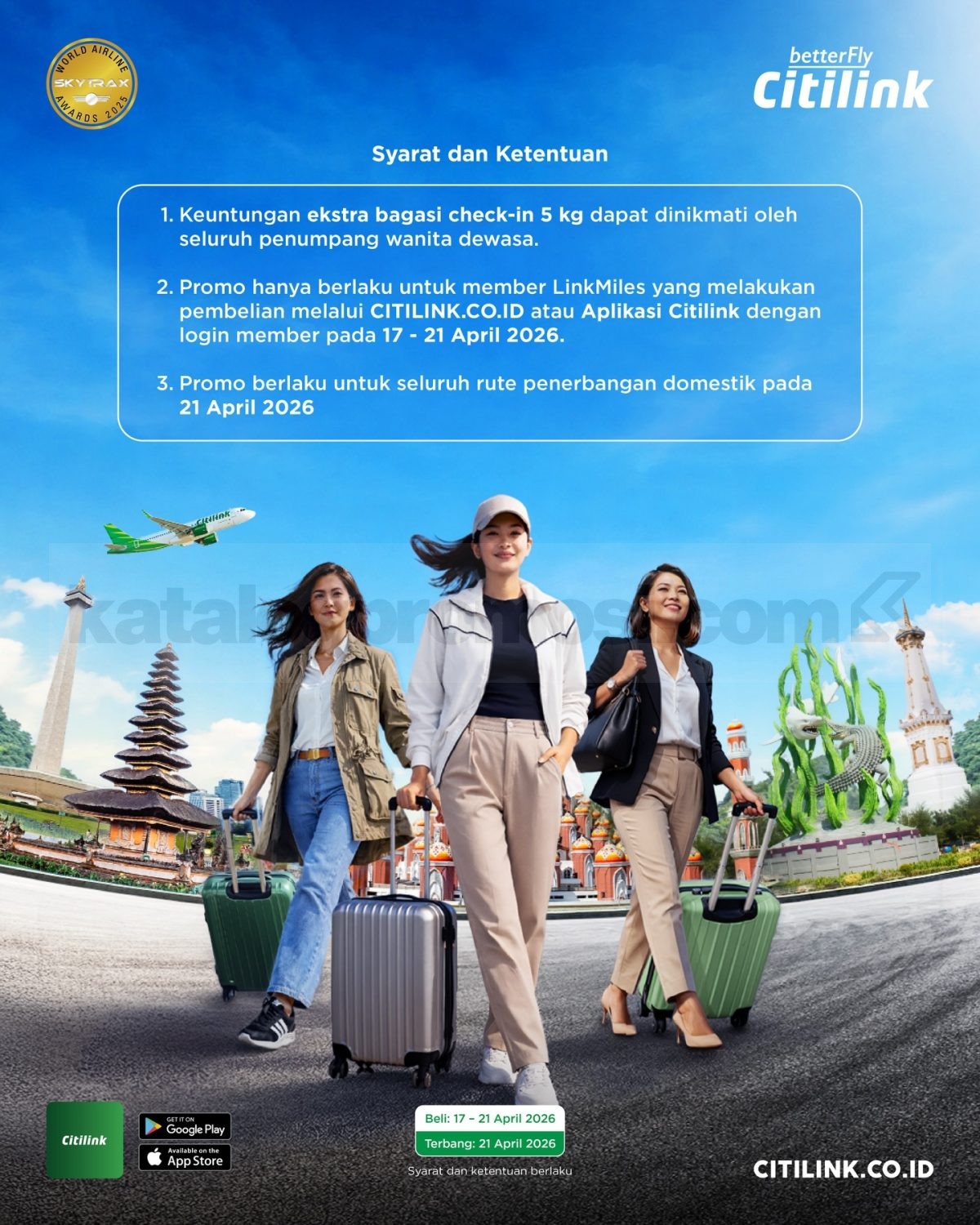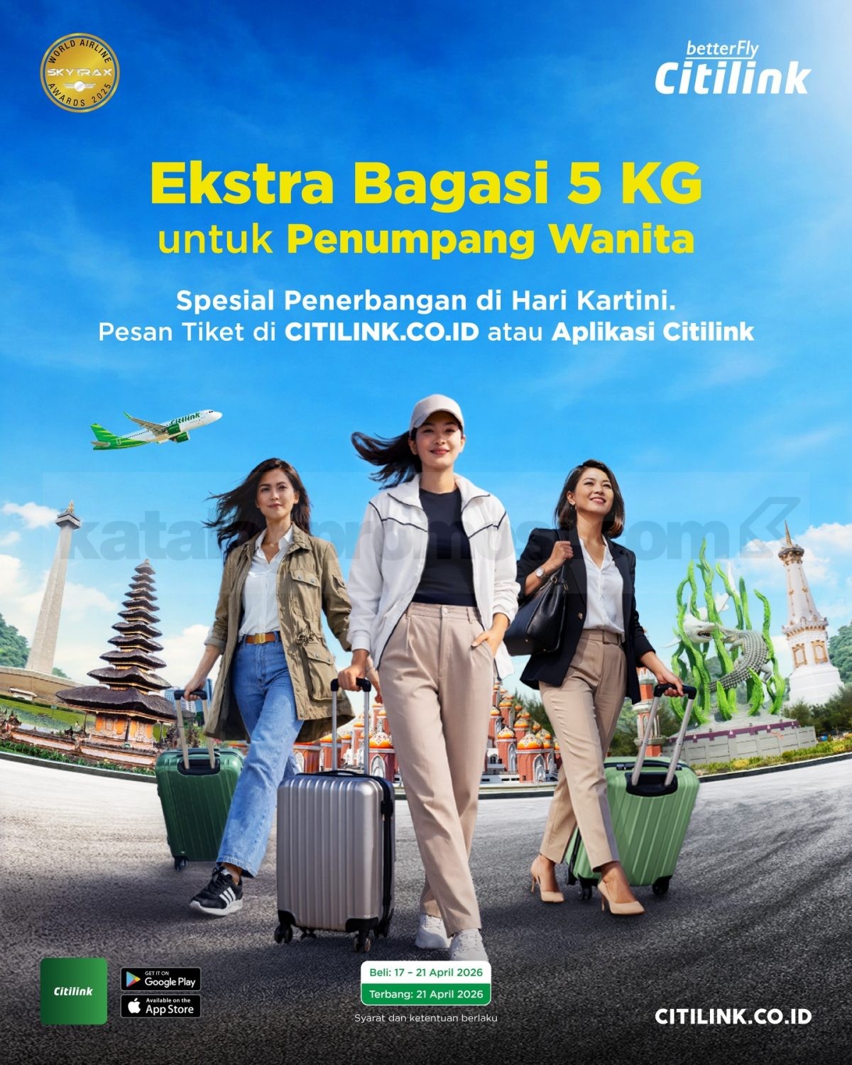 Promo Citilink Hari Kartini Ekstra Bagasi 5 KG Penumpang Wanita periode beli 17 – 21 April 2026 untuk terbang 21 April 2026 khusus member LinkMiles melalui citilink.co.id atau aplikasi Citilink rute domestik.
