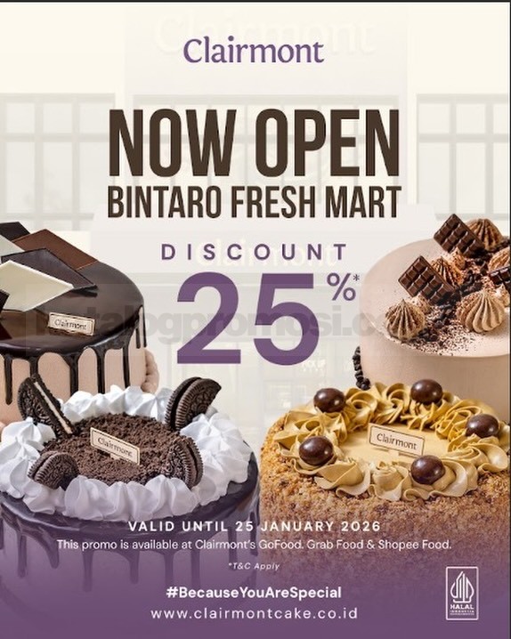 Promo Clairmont Opening Store Bintaro Fresh Mart Discount 25% untuk cake pilihan via online, berlaku mulai tanggal 10 Januari 2026 – 25 Januari 2026.