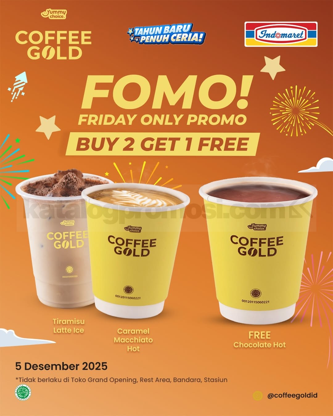 Promo Coffee Gold FOMO Friday Free Chocolate Hot, beli 2 Tiramisu Latte Ice/Caramel Macchiato Hot gratis 1 Chocolate Hot, berlaku 5 Desember 2025.