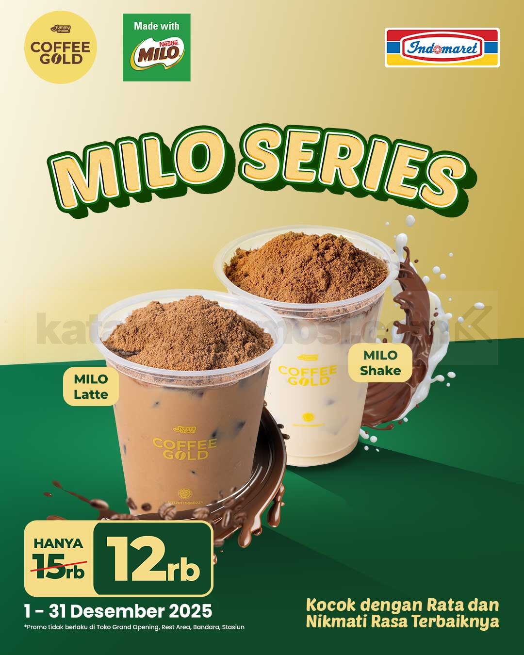 Mending langsung cobain varian baru MILO Series ini di outlet Coffee Gold kesayanganmu di Indomaret. Dengan promo spesial, kamu bisa dapatkan harga hanya Rp. 12.000 dari harga normal Rp. 15.000 mulai tanggal 1β31 Desember 2025. Promo ini tidak berlaku di toko grand opening, rest area, bandara, maupun stasiun.