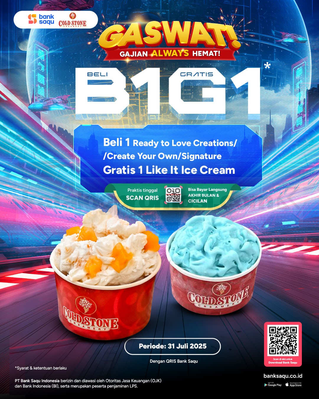 Berlaku di outlet Cold Stone tertentu yang menerima pembayaran QRIS Bank Saqu.