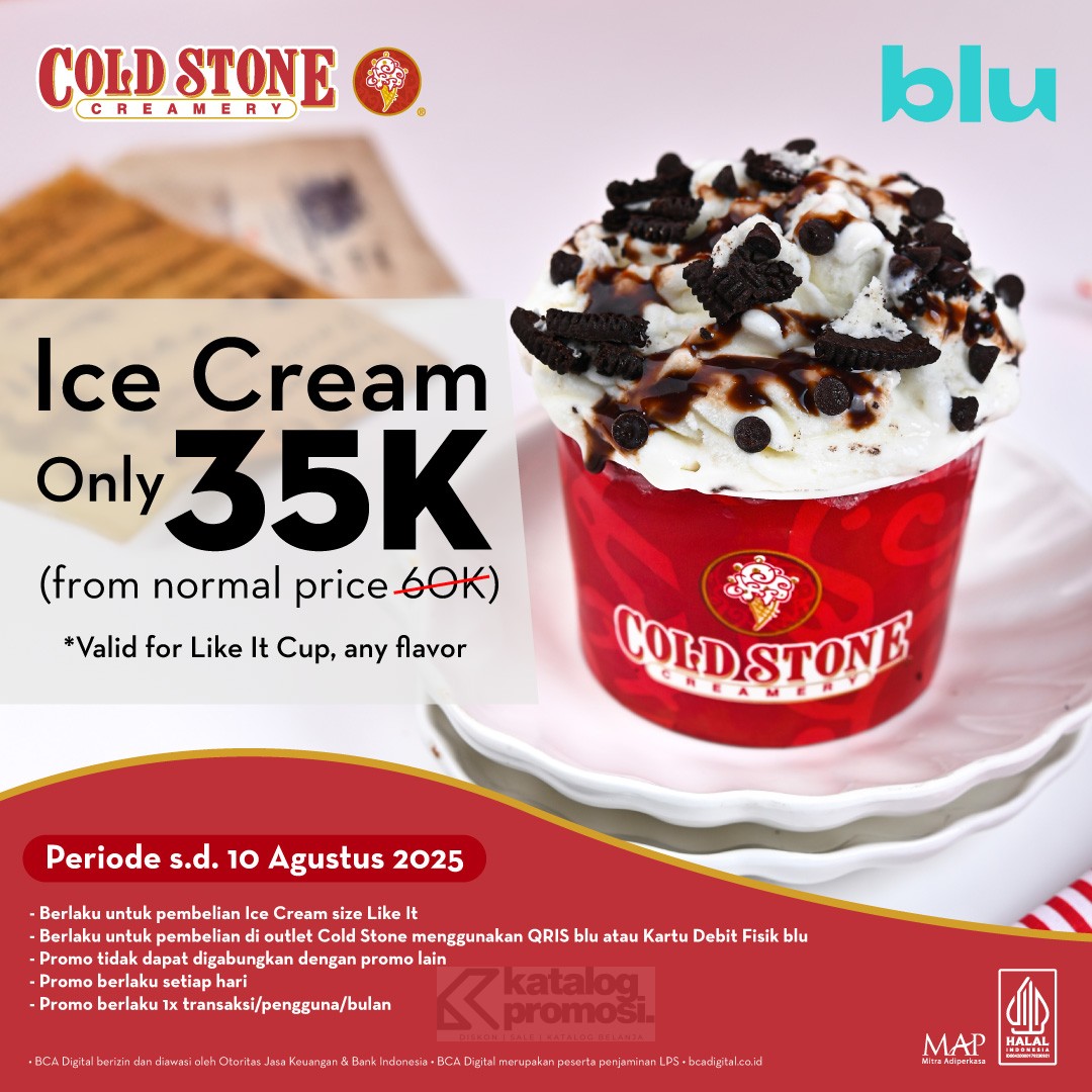 Buat para pencinta es krim, ada kabar manis nih! 🍦 Promo Cold Stone Blu by BCA lagi berlangsung, dan kamu bisa nikmatin ice cream favoritmu hanya dengan Rp 35.000 aja! Nggak ada drama pilih-pilih rasa, karena promo ini berlaku untuk semua rasa dan kreasi di size cup Like It (4oz). Mau choco, vanilla, atau mix topping seru? Bebas pilih sesuai selera kamu! 😋