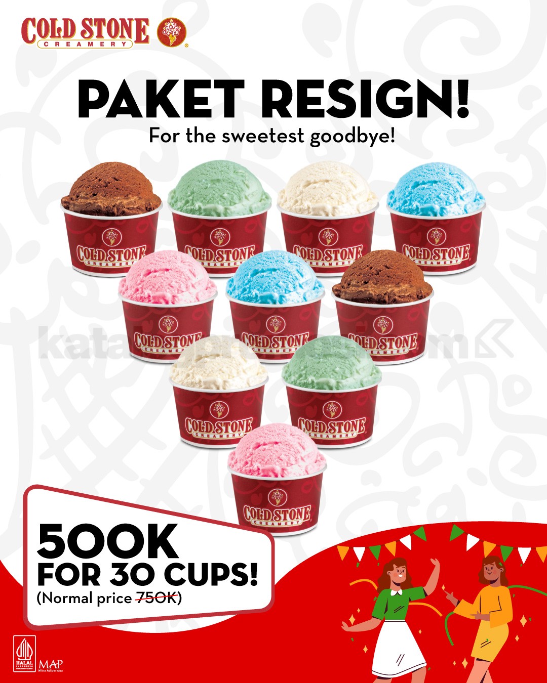 Promo Cold Stone Paket Resign 30 Cups harga Rp. 500.000 jadi pilihan manis untuk momen perpisahan kantor, berlaku selama persediaan masih ada di seluruh outlet dan via GoFood serta GrabFood.