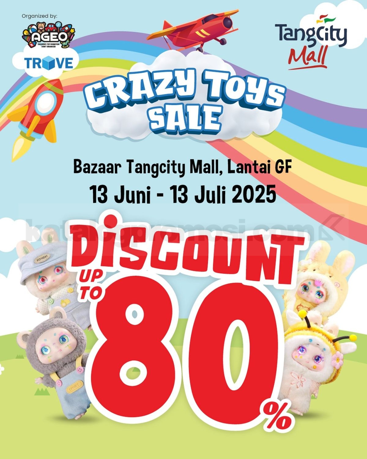 Crazy Toys Sale kembali hadir di Tangcity Mall dengan diskon GILA-GILAAN sampai 80%! Mulai dari mainan anak, koleksi hobi, sampai blind box lucu — semuanya bisa kamu temuin di satu tempat.