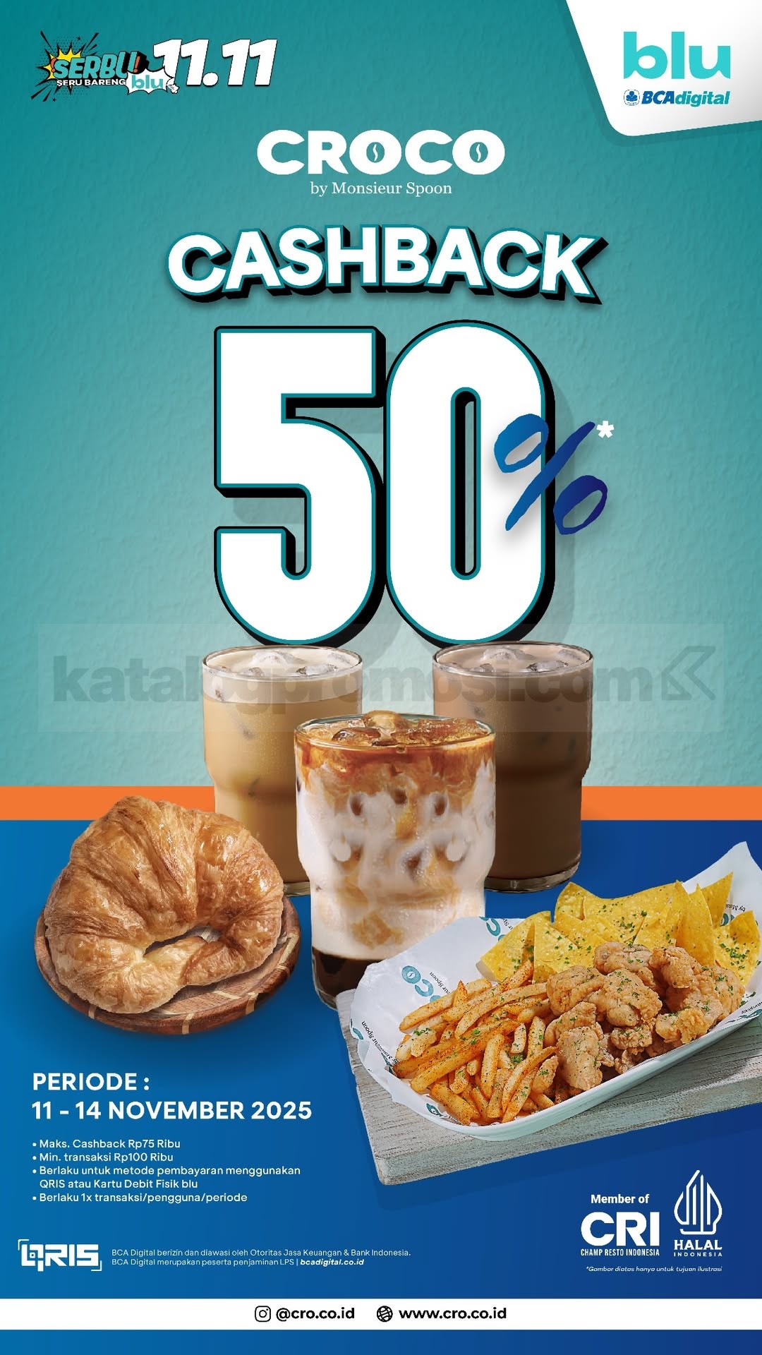Promo Croco 11.11 Cashback 50% pakai blu by BCA, maksimal cashback Rp. 75.000, berlaku 11-14 November 2025 untuk pembayaran QRIS & Kartu Debit Fisik blu.