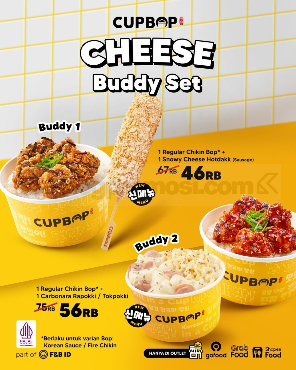 Promo Cupbop Cheese Buddy Set menu duo mulai Rp. 46.000, pilihan Korean Sauce atau Fire Chikin Bop untuk makan bareng, berlaku mulai 23-5 Februari 2026 di seluruh outlet.