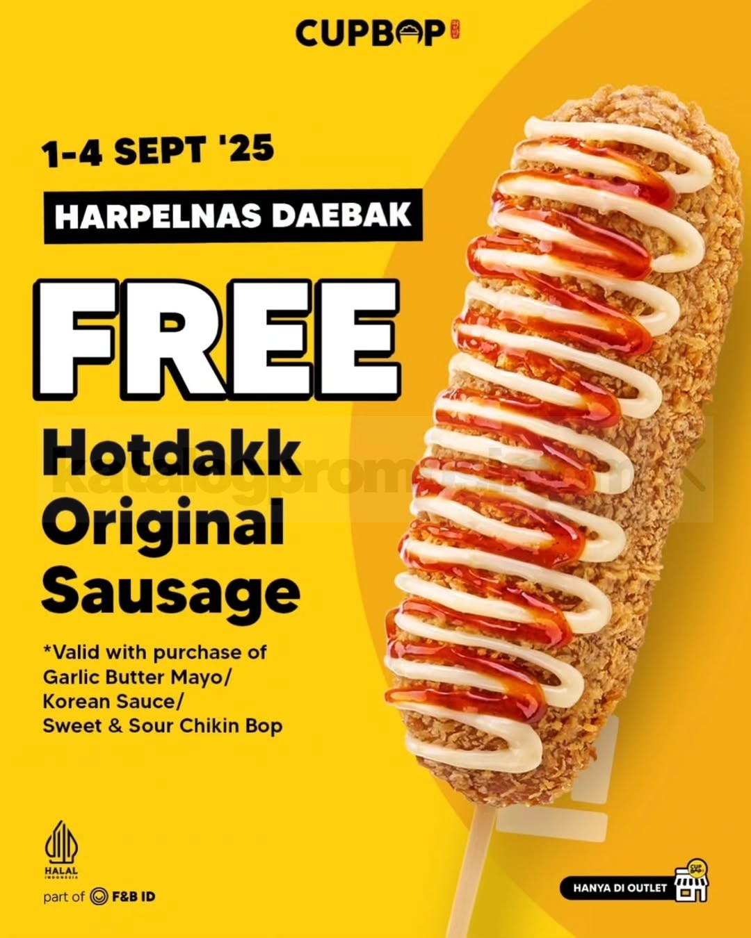 Promo CUPBOP Harpelnas free Hotdakk Original Sausage dengan pembelian Garlic Butter Mayo, Korean Sauce, atau Sweet & Sour Chikin Bop, berlaku 1โ4 September 2025.