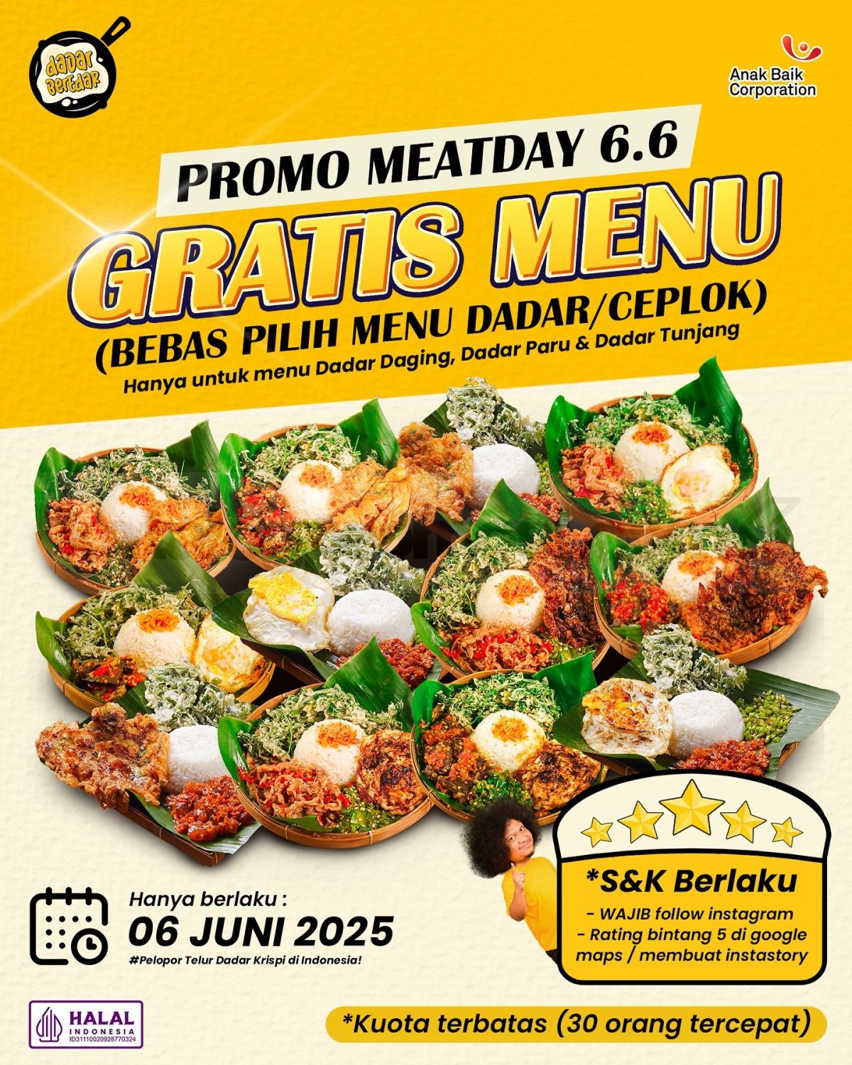 Promo diskon 50% berlaku hanya pada tanggal 23 Oktober 2025 untuk semua menu Dadar Beredar di outlet Cibubur.