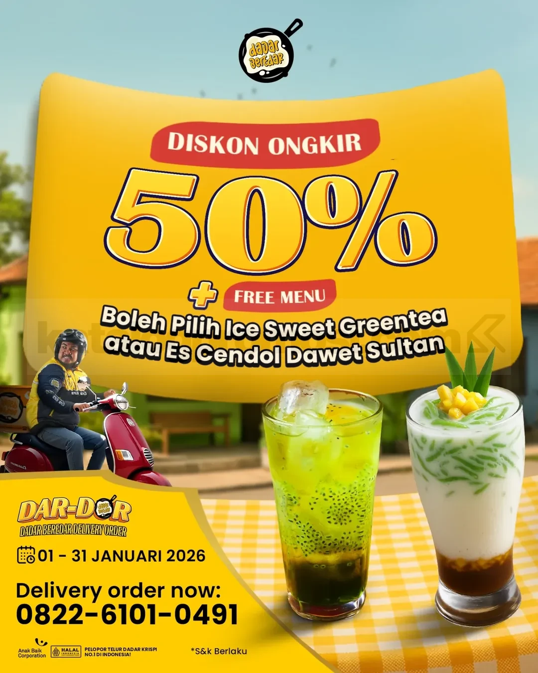 Promo Dadar Beredar Diskon Ongkir 50% + Free Menu Ice Sweet Greentea & Es Cendol Dawet, berlaku mulai tanggal 01 – 31 Januari 2026.