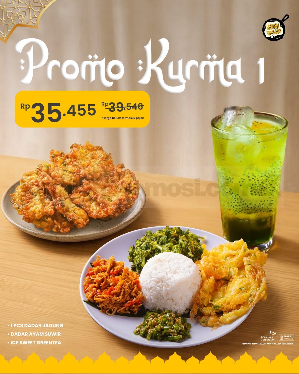 • Paket Kurma 1 dengan 1 pcs dadar jagung, dadar ayam suwir, dan ice sweet greentea seharga Rp. 35.455