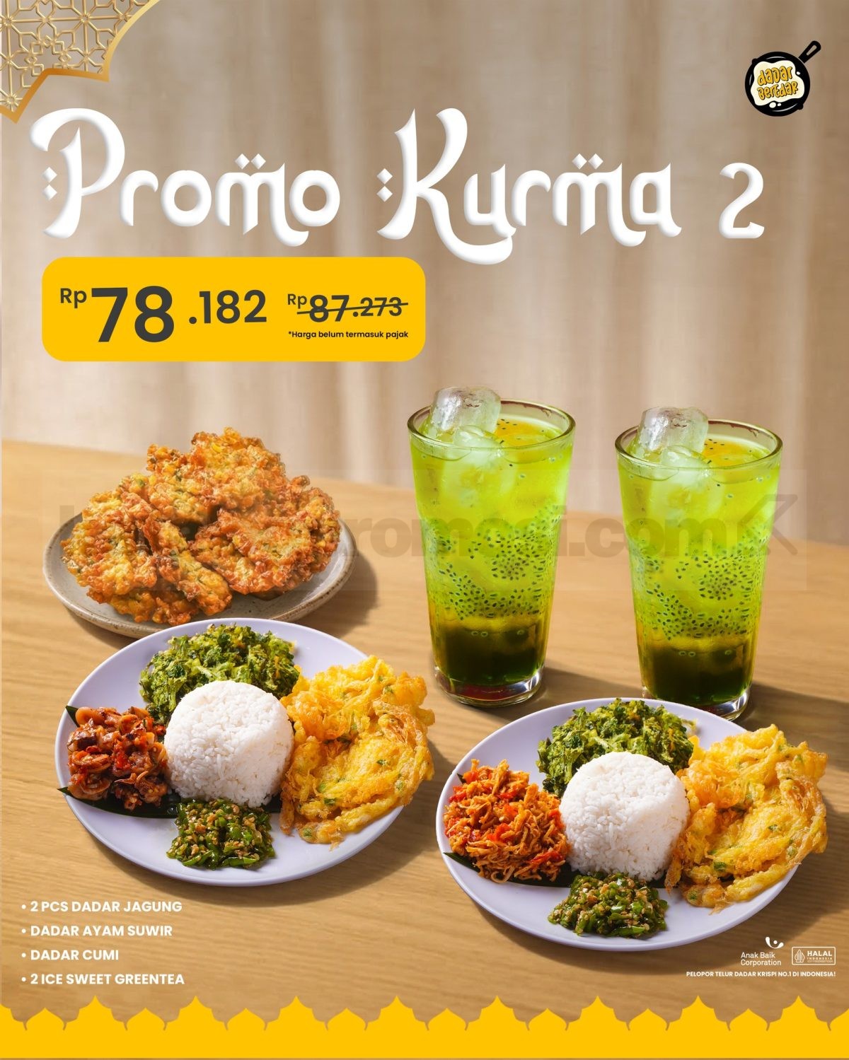 • Paket Kurma 2 berisi 2 pcs dadar jagung, dadar ayam suwir, dadar cumi, serta 2 ice sweet greentea dengan harga Rp. 78.182