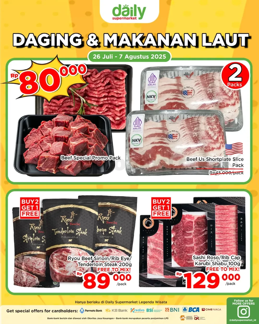 - Ryou Beef Sirloin/Rib Eye/Tenderloin Steak 200g → Rp. 89.000/pack → BUY 2 GET 1 FREE